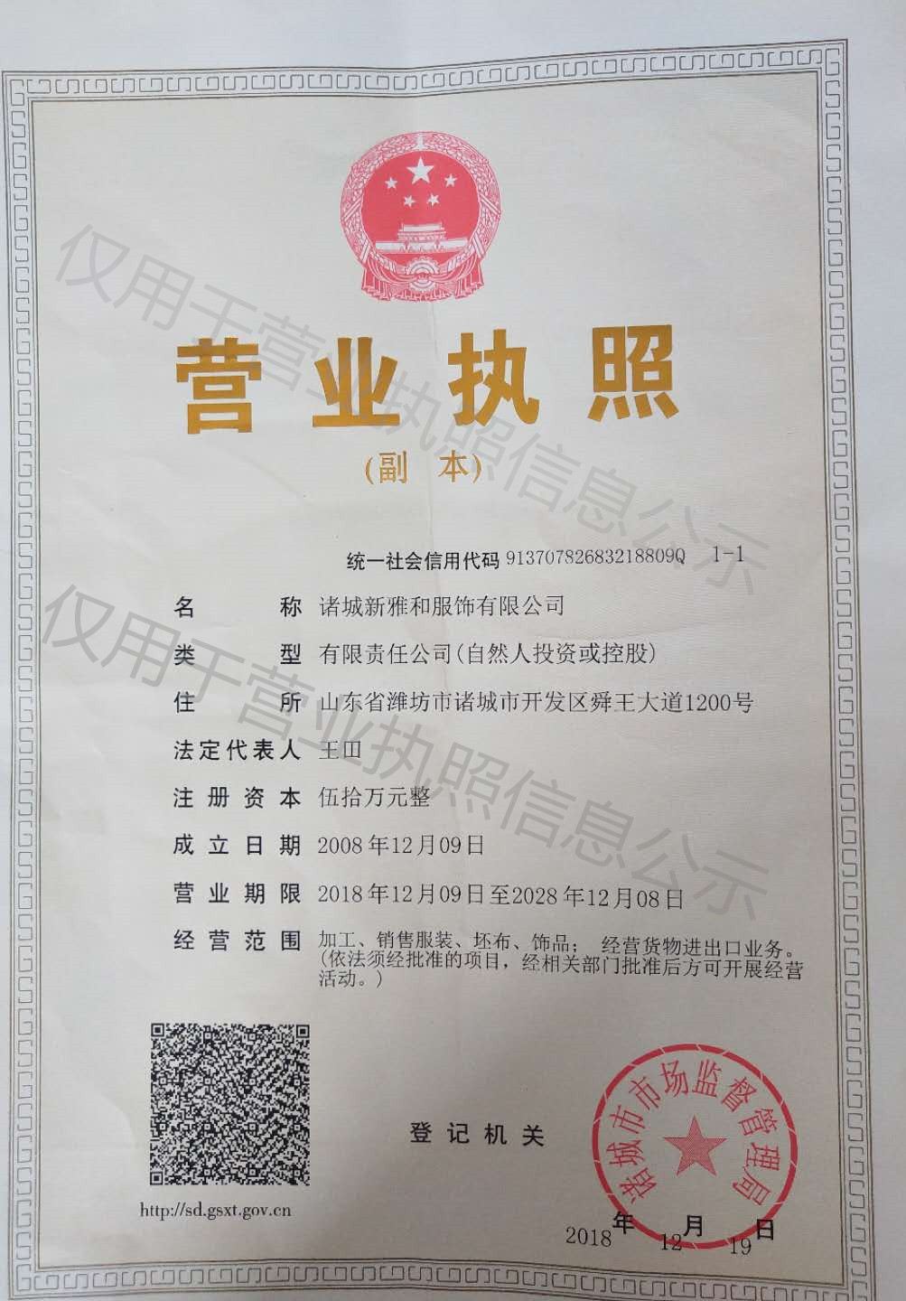 諸城新雅和服飾有限公司的誠信、實(shí)力、產(chǎn)品質(zhì)量、管理團(tuán)隊(duì)獲得業(yè)界及日本眾多客戶的認(rèn)可與贊賞。下一個(gè)五年計(jì)劃,我們將借鑒、學(xué)習(xí)國內(nèi)外企業(yè)的發(fā)展經(jīng)驗(yàn),積極開發(fā)具有時(shí)尚文化元素、功能性的針織服飾,服務(wù)于社會(huì),服務(wù)于廣大消費(fèi)者;為社會(huì)、為城市、為消費(fèi)者制造并展現(xiàn)美麗、健康、快樂的針織服裝服飾。 公司已經(jīng)通過安全生產(chǎn)標(biāo)準(zhǔn)化管理評(píng)審,成為濰坊地區(qū)安全生產(chǎn)達(dá)標(biāo)企業(yè)。